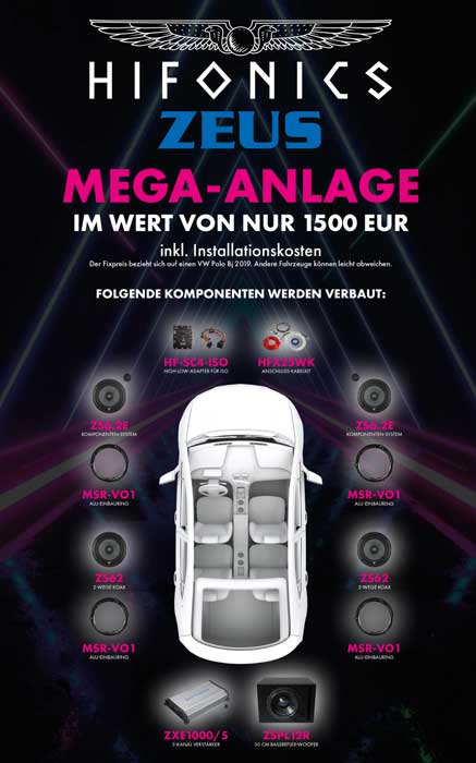 Hifonics-Mega-Komplett-Anlage inkl. Einbau beinhaltet: