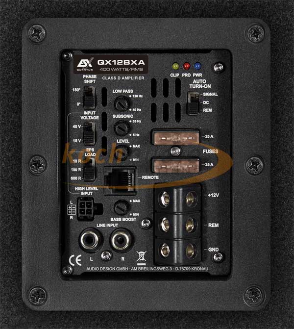 In den High-End QXP-Gehäusen arbeitet das mehrfach ausgezeichnete POWER4 Class D Aktivmodul, das mit satten 1000 Watt Peak an 4 Ohm souveräne Leistungsreserven bereitstellt. Das Modul verfügt über eine ausgeklügelte Schaltungstechnik im Eingang: Dank des von ESX entwickelten „EPS PRO“ High-Level-Inputs ist das Modul vollständig kompatibel mit modernen Fahrzeugen und deren sensiblen Fehlerdiagnose-Systemen. Auch bei der Ausstattung zeigt sich das Modul kompromisslos: regelbare Subsonic- und Lowpass-Filter, Bass Boost sowie ein Phasenschalter ermöglichen eine präzise Abstimmung des Bassfundaments. Die Signalzuspielung erfolgt wahlweise über Cinch oder High-Level-Eingänge. Für maximalen Komfort sorgt die im Lieferumfang enthaltene Basspegel-Fernbedienung, mit der sich der Basspegel jederzeit bequem vom Fahrersitz aus regeln lässt. Technische Daten